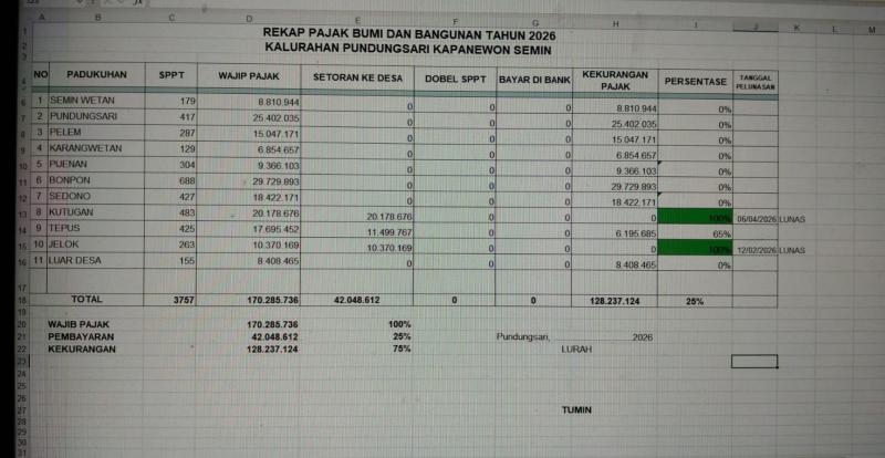 Lurah Pundungsari Bapak Tumin Mengapresiasi Kepada Padukuhan di atas Yang Konsisten Untuk Lunas PBB P-2 Tahun 2026. Dan Semoga saja Segera Diikuti Oleh Padukuhan-Padukuhan Lainya.