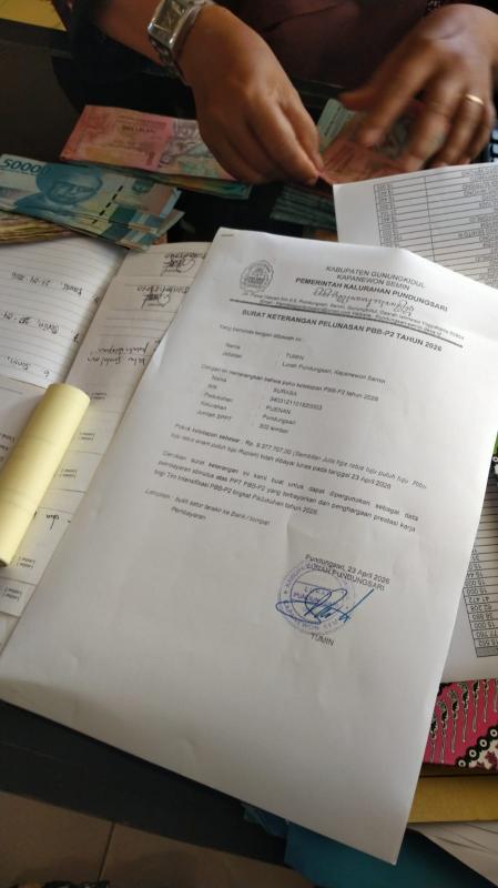 Pundungsari, ( SIDA ) Setelah Padukuhan Jelok,Kutugan,Tepus dan Karangwetan Lunas PBB P-2 Tahun 2026, Pada Hari ini Kamis 23 April 2026 Padukuhan Pijenan melunasi pembayaran PBB P-2 Sebesar Rp 9.377.767,00 ( Sembilan Juta Tiga Ratus Tujuh Puluh Tujuh Ribu Tujuh Ratus Enam Puluh Tujuh Rupiah ) dilaksanakan Kolektif melalui petugas pungut di Padukuhan Pijenan.Bapak SURASA Sehingga di kalurahan Pundungsari yang Lunas Membayar PBB-P2 2026 Ada 5 Padukuhan. Yaitu padukuhan Jelok ,Kutugan, Tepus, Karangwetan Dan Pijenan